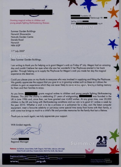 I am writing to thank you for helping us to grant Megan's wish on Friday 6th July. Megan had an amazing day and couldn't believe her eyes when she saw her wonderful 2 tier Playhouse erected in her back garden. Through helping us to supply the Playhouse for Megan's wish you made her day the magical experience she deserves.