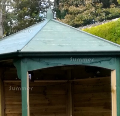 We are really delighted with the quality of the building and the inside of the roof is really beautiful. It has made a great addition to our garden. We've fitted removable perspex 'windows over the 2 'windows' and the slated sides, which keeps it warmer in the cool months, fitted a pendant light/heater from the central roof wood, sealed some of the joints to stop leaks with transparent sealant and painted the exterior green.