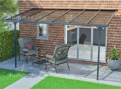 PICTURE: A metal-framed lean to gazebo with a polycarbonate roof.
