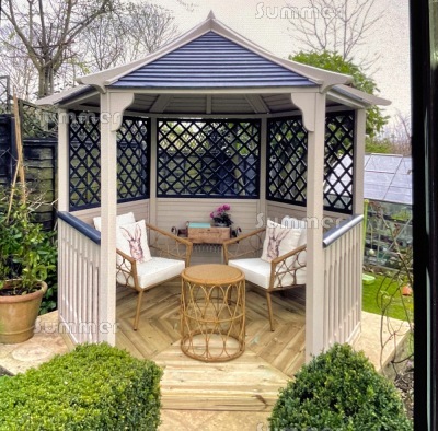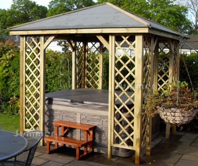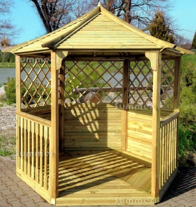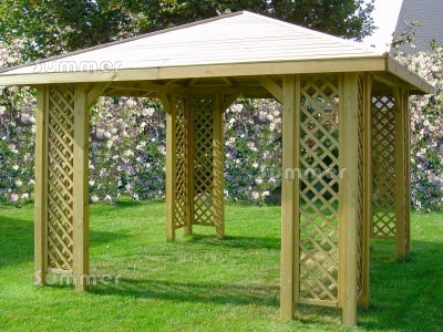 We offer a popular range of great value pressure treated wooden gazebos which feature prefabricated panels. The range includes hexagonal, octagonal and hipped roof designs with prefabricated wall panels. The hexagonal and octagonal gazebos also include prefabricated roof panels but the larger hipped roof gazebos include pre-cut boards. The substantial wall panels are normally 45mm finished thickness and joinery made with morticed and tenoned corners. A mixture of wall panel designs is available to suit individual preference, including decorative diamond trellis panels, joinery palisade panels and fully boarded tongued and grooved panels for privacy. With prefabricated panels installation is normally a little quicker and easier.