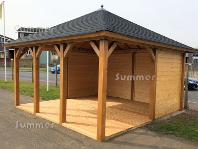 PICTURE: A wooden gazebo with a side summerhouse, a low roof pitch and a fully boarded wall.
