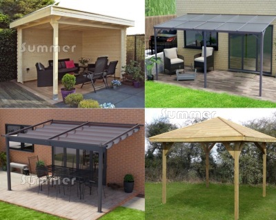 The majority of metal framed gazebos are cheaper and lighter in weight with removable or retractable fabric canopies. Metal gazebos are very popular, normally needing much less initial investment and less effort to install. The majority of our metal gazebos, especially the cheaper ones, are in stock most of the time and available for fast delivery within a few days. We also offer some more substantial metal framed gazebos with a choice of more permanent polycarbonate and fibreglass slate effect roofing.