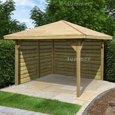 PICTURE: A gazebo with 2 fully boarded sides and a side shed or summerhouse.