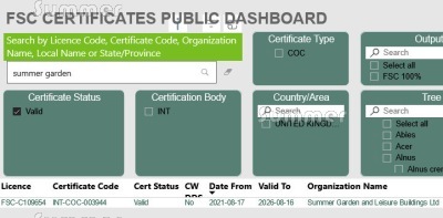 - To verify our FSC membership visit the FSC Member Search and search for Summer Garden (full name "Summer Garden and Leisure Buildings Ltd"). Our FSC licence number is FSC-C109654 and our FSC chain of custody certificate code is INT-COC-003944.