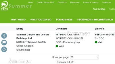 - To verify our PEFC membership visit the PEFC Find Certified and search for Summer Garden (full name "Summer Garden and Leisure Buildings Ltd"). Our PEFC certificate number is INT-PEFC-COC-1119. Our PEFC licence number is PEFC/16-37-2190.