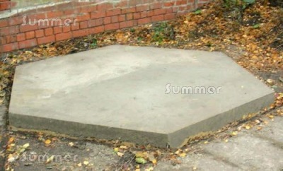 A concrete base is the most permanent and durable base for a garden building but a paving slab base is cheaper and more popular. A concrete base requires shuttering boards with a sturdy frame. Wet concrete is poured in and tamped smooth with a straight edge. A concrete base is often the best option for a building with no floor, such as a garage or a commercial workshop, or for a building which contains heavy machinery or equipment, such as a pump room or a hot tub enclosure. The concrete is normally finished a few inches above the ground. Inexpensive steel reinforcing can be placed within the concrete for extra strength at sites with poor ground conditions, for example where trees and shrubs have been removed.