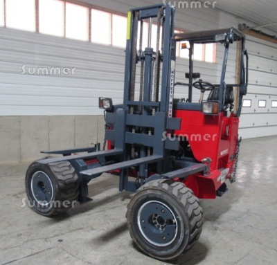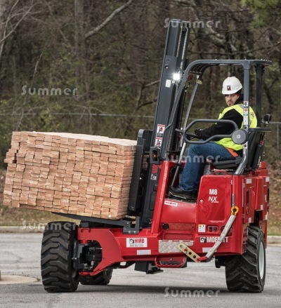 PICTURE: A truck mounted forklift driving sideways with a load.