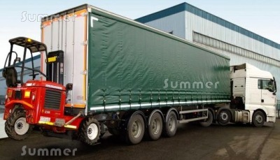- The delivery vehicle is an articulated lorry with a forklift mounted at the rear.