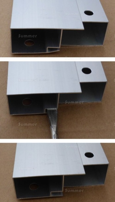 PICTURE: The series of 3 pictures above shows a pair of framing profiles, one with minor damage to the cladding groove, which is gently prised open with the screwdriver to repair it within a few seconds.