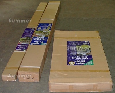 PICTURE: A typical polycarbonate greenhouse awaiting dispatch, with 2 boxes of metal components 9' long (2.7m) and a glazing box 5' long (1.5m).