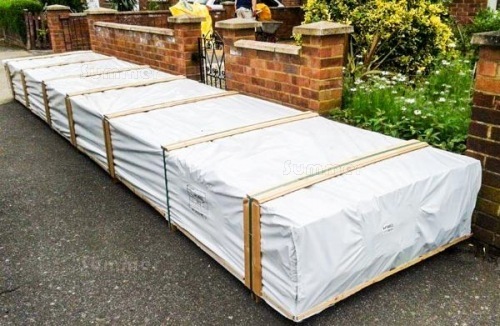 - The pack is covered on all sides with opaque black or white polythene which protects it from the elements and conceals the contents. It can remain outside for a week or two before installation.