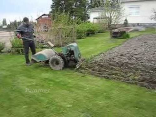 1982: One of the first pieces of machinery the new business aquired was an old 1950s Clifford rotavator, pictured below. The rented 3hp and 5hp rotavators available at the time were simply not powerful enough. This much bigger machine with powered wheels and powered tines was much more effective. But the powered spring tines could throw a brick or stone out of the back at some speed which caused repeated cuts and bruises to shins. It was also an old and unreliable engine which suffered too much expensive down time.