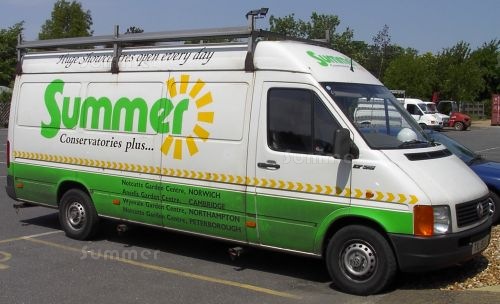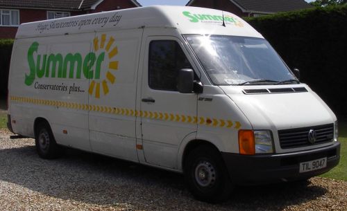 1998: The 3 pictures below show a brand new Volkswagen van. It is a long wheel base high roof van, the largest model available, which our conservatory fitters loved. The strange unfamiliar number plate is Irish. At the time we saved several thousand pounds each time we imported a new van from the Republic of Ireland. In the first 2 pictures the signwriting is not finished and the roof rack and side frail have yet to be fitted. In the third picture the signwriting, the roof rack and the side frail are all finished but the van is not so clean.