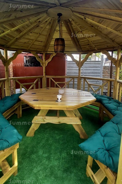 We are really delighted with the quality of the building and the inside of the roof is really beautiful. It has made a great addition to our garden. We've fitted removable perspex 'windows over the 2 'windows' and the slated sides, which keeps it warmer in the cool months, fitted a pendant light/heater from the central roof wood, sealed some of the joints to stop leaks with transparent sealant and painted the exterior green.