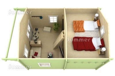 Some of our 3 room apex log cabins are designed with 3 rooms as standard, including a large front room and two small rooms at the rear. The front room is normally used as a summerhouse, a garden office or the main living room of a small lodge. The small rooms may be two bedrooms or a bedroom and a bathroom. There is often a loft area above the two small rooms, accessed with a ladder, which makes a useful storage space or it can be an exciting den or bedroom for the kids. One of the small rooms can be used as a shed if the design includes an external door.