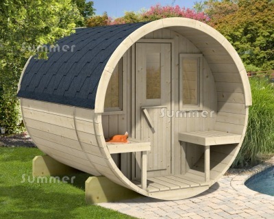 Our barrel saunas are an attractive and compact sauna. The rounded shape of the sides and roof requires a slightly different interlocking joint with a ball and socket shape. Stainless steel bands or hoops are stretched around the circumference to tighten the joints. These are similar to the steel hoops used in traditional barrel construction. The compact size and shape makes our barrel saunas easier to heat than other buildings. With less ground contact than other buildings, our barrel saunas also draw up less cold and damp from the ground during the winter months.
