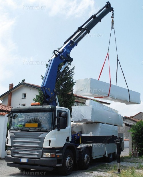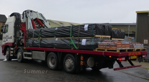 - The delivery vehicle is a flat bed lorry with a truck mounted crane, similar to the lorry pictured above.