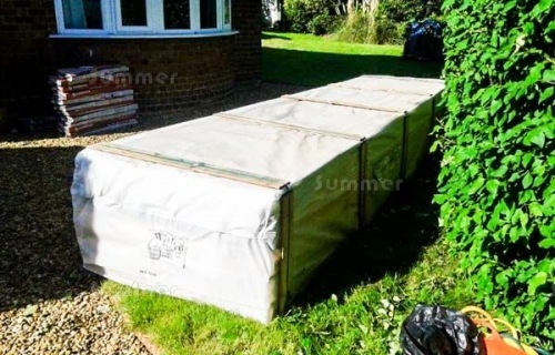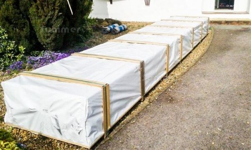 - The pack is covered on all sides with opaque black or white polythene which protects it from the elements and conceals the contents. It can remain outside for a week or two before installation.