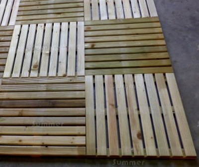 All timber is pressure treated which ensures a longer lifespan. Pressure treatment is a lifetime preservative treatment. Each tile is 500mm x 500mm in area with a reeded finish. A small gap between each board allows for expansion and contraction of the timber in varying climatic conditions. If required, substantial timber bearers can be used below the tiles allow ventilation under the floor which reduces dampness inside the building. If required, timber bearers should be at least 2"x2", pressure treated and spaced around 10" or 250mm apart.
