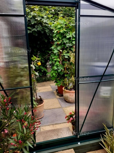 - Strong aluminium greenhouse frame in a powder coated green finish